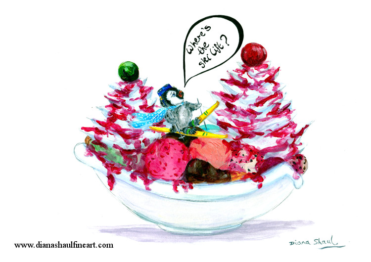 Story: I've been looking forward to this for so long – and this morning I heard the churning of the ice-cream maker! My best hopes were confirmed when just a few minutes ago I heard that sound you only hear when someone's squirting out a swirl of whipped cream. So of course I put on my hat, scarf and skis. And then I tracked down the sundae. It's absolutely perfect, with not one but two mountains for me to ski down! But I'm kinda stuck here in the valley. So may I please ask you a question? Where's the ski lift?